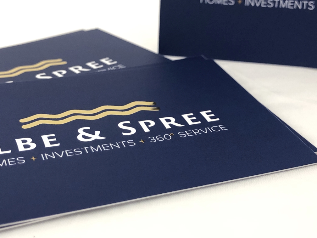 Seit 2015 ist die Elbe & Spree Immobilien GmbH zufriedener Kunde bei uns. Diverse Drucksachen, wie Mappen, Stempel, Schilder, Aufkleber und Karten jeglicher Art hat das Immobilien-Unternehmen in den vergangenen Jahren bei uns produzieren lassen. Besonders edel wirken jedoch die matt laminierten Visitenkarten mit ihrer Goldprägung.